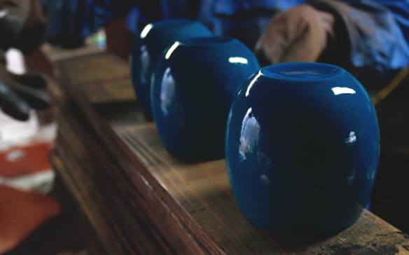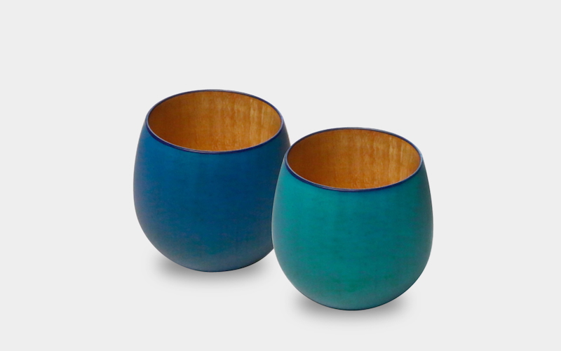 「Kyutarou BLUE」のカップは、約1500年続く越前漆器の産地でつくられる1点もの。越前の職人が食器用ウレタン塗料を使い、天然木の器にひとつずつ丁寧に吹付けていきます。